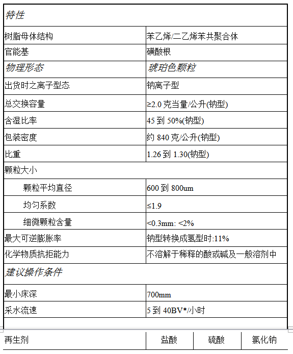 AMBERLITE IR120Na是一种磺酸化苯乙烯系凝胶型强酸性阳离子交换 树脂。适合用于软化(钠离子型)及顺向再生纯化系统(氢离子型),具有极佳的物理、化学及热稳定性,良好的离子交换能力与高交换容量特性。