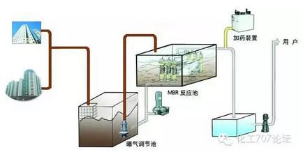 把膜组件置于生物反应器内部。进水进入膜--生物反应器,其中的大部分污染物被混合液中的活性污泥去除,再在外压作用下由膜过滤出水。