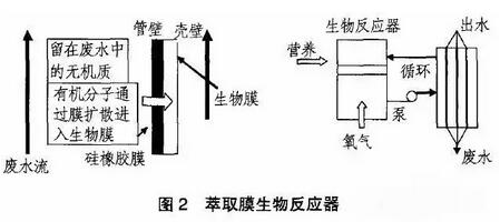 为了解决这些技术难题,英国学者Livingston研究开发了EMB。废水与活性污泥被膜隔开来,废水在膜内流动,而含某种专性细菌的活性污泥在膜外流动,废水与微生物不直接接触,有机污染物可以通过选择性透过膜被另一侧的微生物降解。由于萃取膜两侧的生物反应器单元和废水循环单元是各自独立,各单元水流相互影响不大,生物反应器中营养物质和微生物生存条件不受废水水质的影响,使水处理效果稳定。系统的运行条件如HRT和SRT可分别控制在最优的范围,维持最大的污染物降解速率。